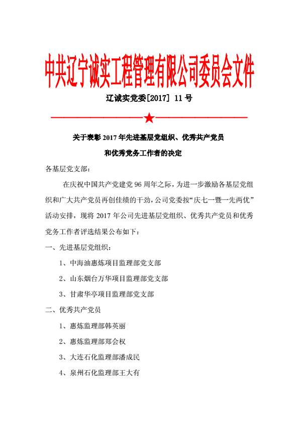 為慶祝中國共產(chǎn)黨建黨96周年,公司黨委于2017年6月30日下午在公司一樓會議室召開了慶祝建黨96周年暨“一優(yōu)兩先”表彰視頻大會。公司機(jī)關(guān)、撫順各項(xiàng)目監(jiān)理部及在撫的黨員同志在主會場參加了大會,中海油惠州項(xiàng)目監(jiān)理部黨支部、甘肅華亭項(xiàng)目監(jiān)理部黨支部、寧夏石化項(xiàng)目監(jiān)理部黨支部、中化泉州項(xiàng)目監(jiān)理部黨支部、廣西石化項(xiàng)目監(jiān)理部黨支部、蘭州石化項(xiàng)目監(jiān)理部黨支部、內(nèi)蒙古君正項(xiàng)目監(jiān)理部黨支部、神華寧煤項(xiàng)目監(jiān)理部黨支部、煙臺萬華項(xiàng)目監(jiān)理部黨支部設(shè)立視頻分會場。黨委委員馬駿主持了視頻大會。首先,公司黨委副書記馮玉琢同志宣讀了“一優(yōu)兩先”表彰決定。接著,黨委書記孫學(xué)良結(jié)合公司實(shí)際做了慶祝建黨96周年的講話。最后全體黨員重溫的入黨誓詞,進(jìn)行入黨宣誓。