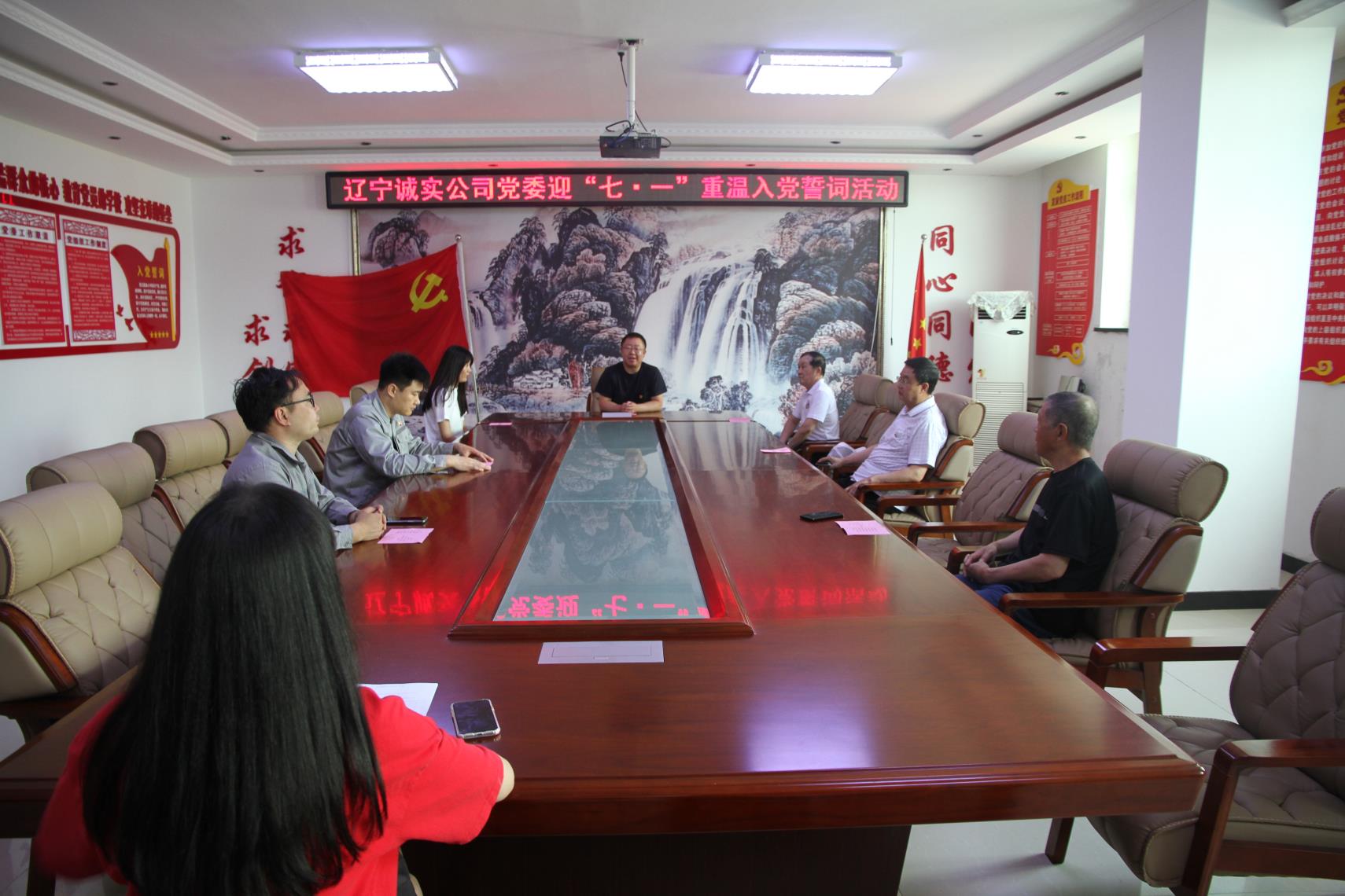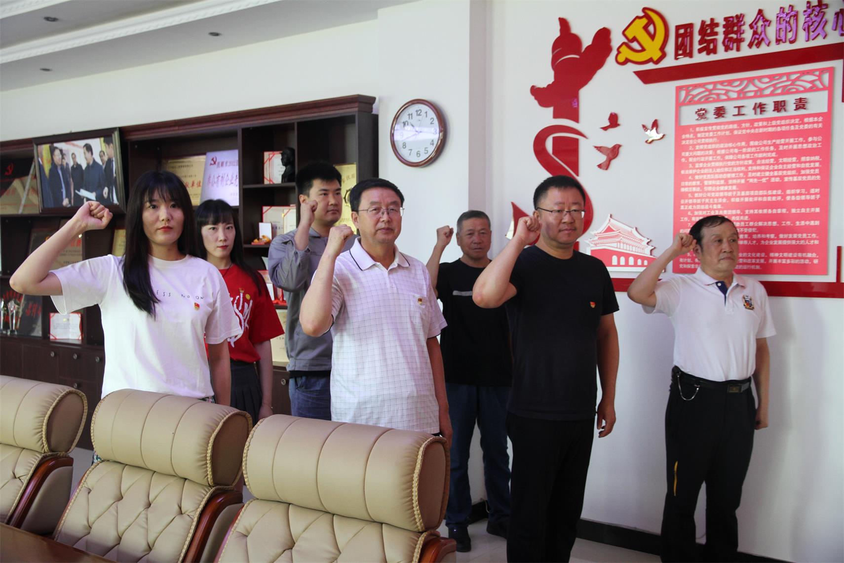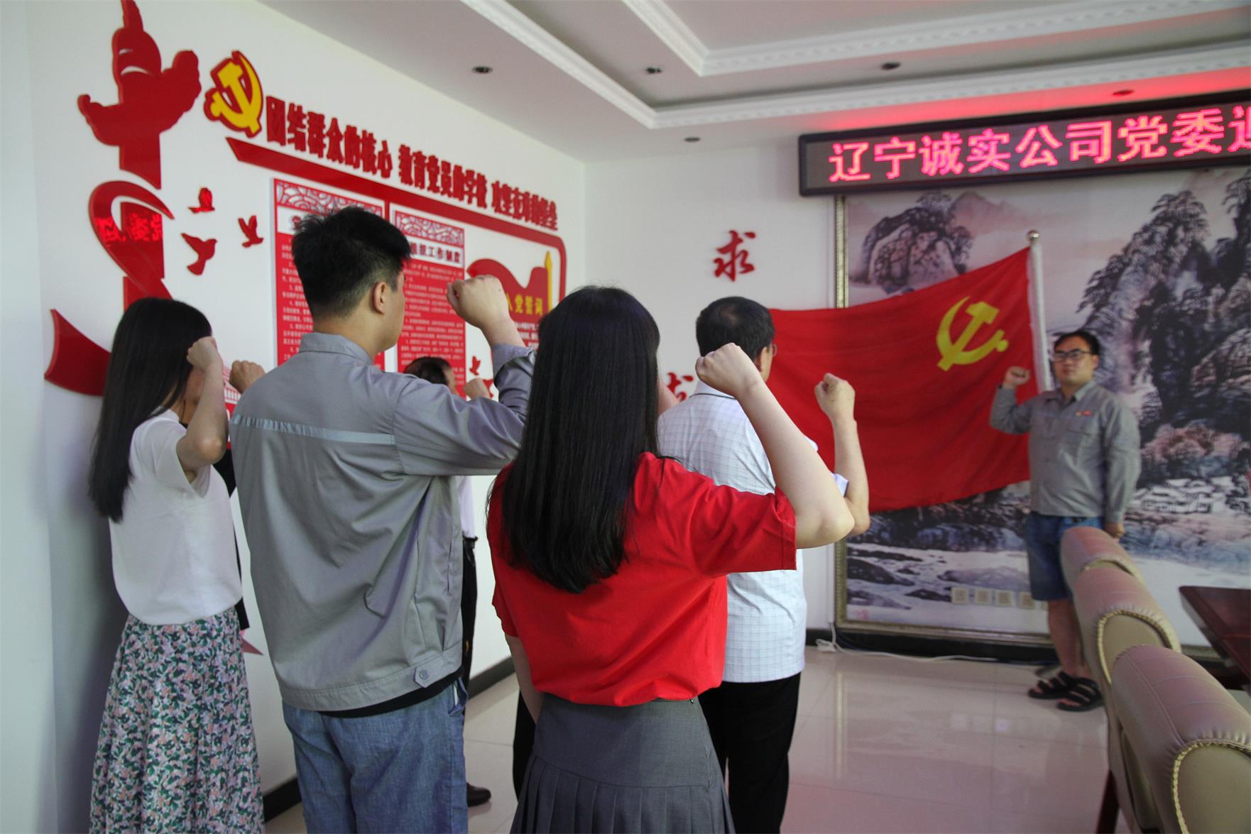 黨員們在公司一樓的黨建活動基地面對著黨旗重溫入黨誓詞,重憶入黨初心,牢記宗旨,錘煉黨性,堅定信念,在錚錚誓言中再燃奮斗激情。