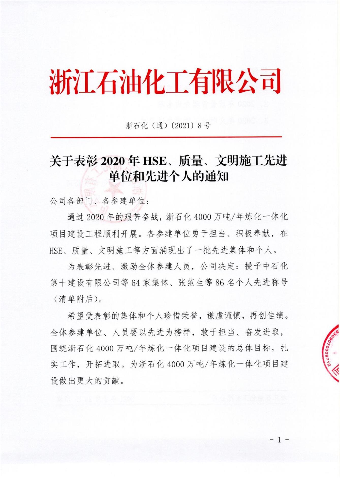 熱烈祝賀沈志強(qiáng)同志榮獲浙江石油化工有限公司4000萬噸/年煉化一體化項(xiàng)目“質(zhì)量管理先進(jìn)個(gè)人”榮譽(yù)稱號(hào)