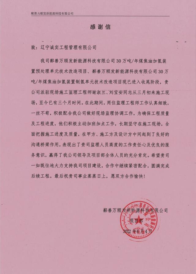 6月6日,公司新疆鄯善項目部收到業(yè)主單位的表揚信。信中,業(yè)主言真意切地對我公司監(jiān)理人員在項目開展期間勤勉盡責的工作精神給予了高度的贊譽和充分的認可。業(yè)主的表揚是對公司綜合實力、服務(wù)質(zhì)量、技術(shù)水平的又一次肯定,誠實人必將以此為動力,在嚴守安全底線、嚴把工程質(zhì)量大關(guān)的道路上砥礪前行!