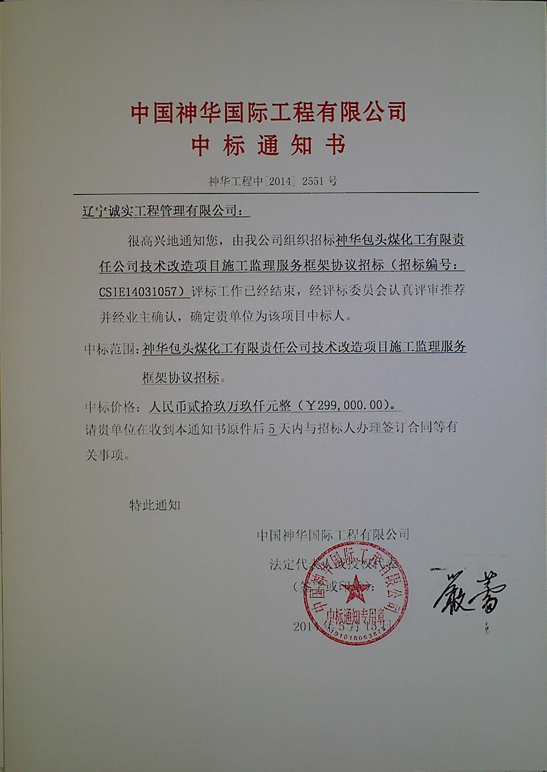 熱烈祝賀我公司成功中標神華包頭煤化工有限責任公司技術改造項目施工監(jiān)理服務項目