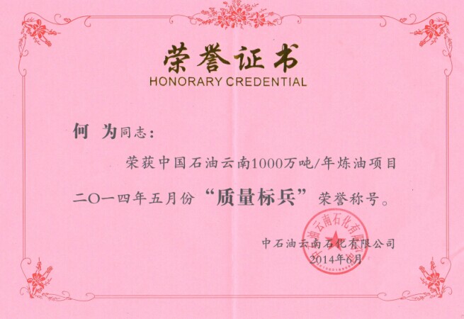 表彰:云南項目部何為同志榮獲中國石油云南1000萬噸/年煉油項目2014年5月份“質(zhì)量標(biāo)兵“榮譽稱號
